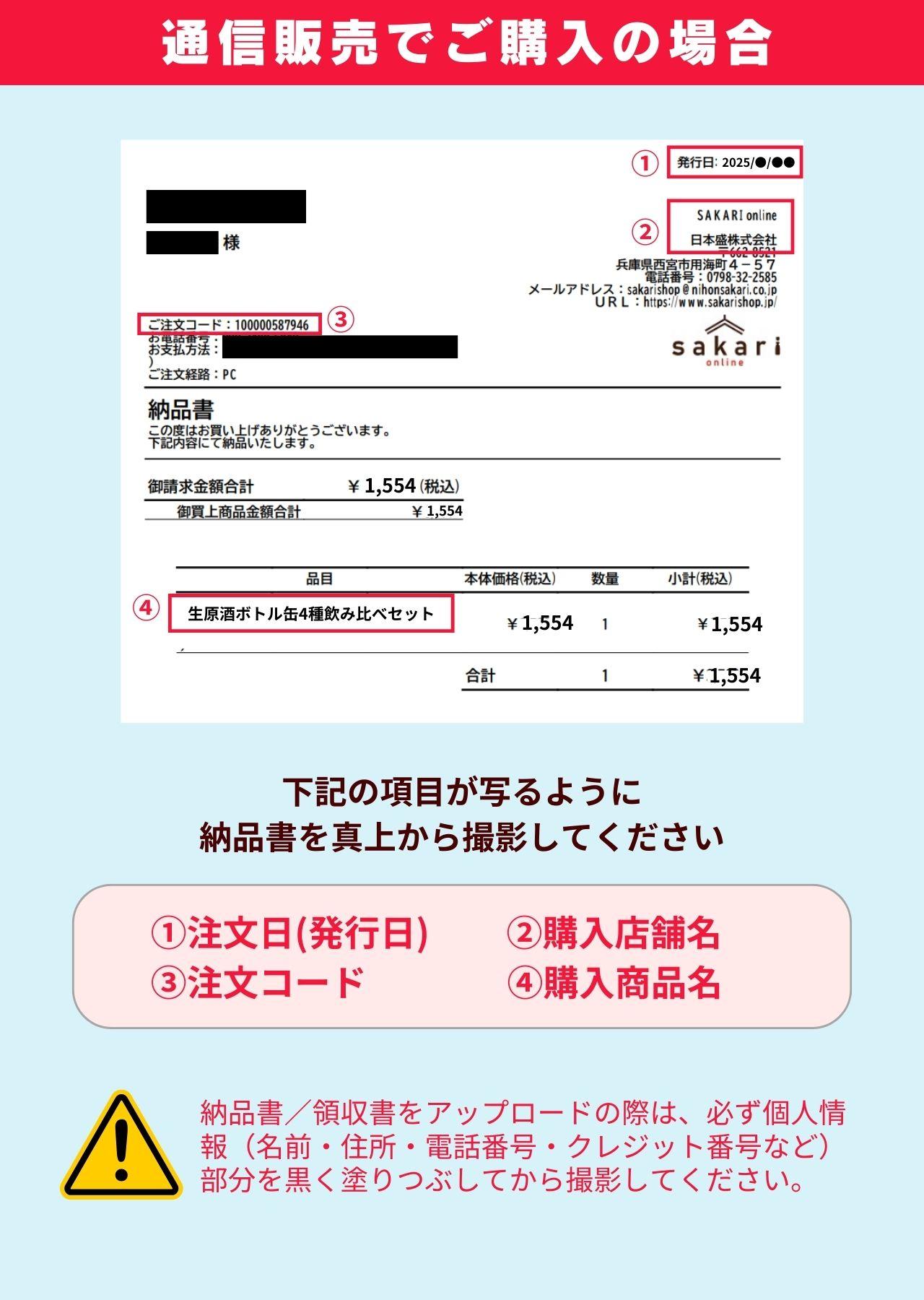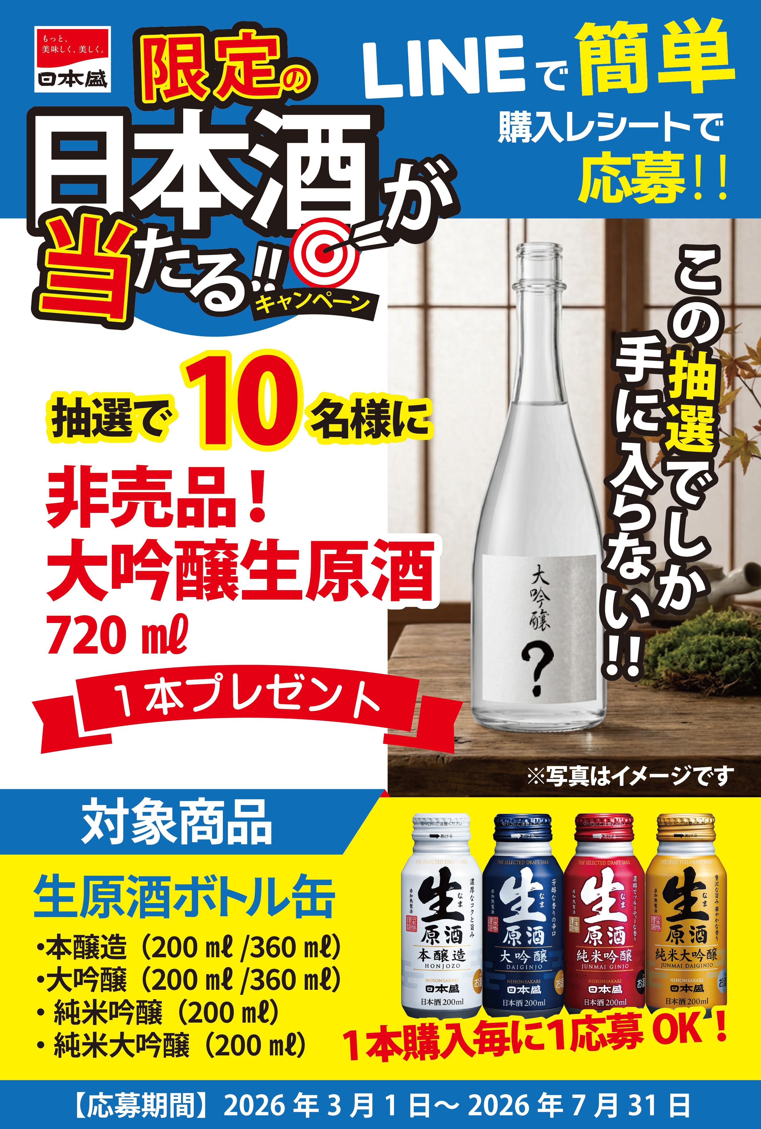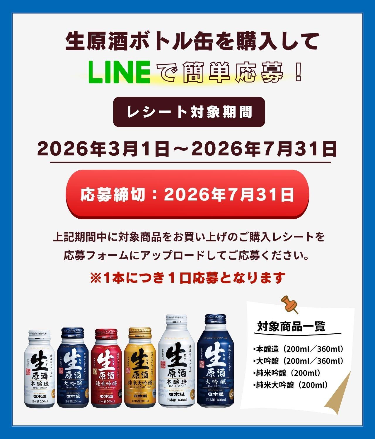 対象商品をお買い上げのご購入レシート(生原酒ボトル缶1本を1口)を、応募フォームにアップロードしてご応募ください。 ※お1人様何口でもご応募いただけます。 ※一度に送信できるファイル数の上限は5個、ファイルのサイズ数は合計10MB(旧フォームは5MB)までです。 |
